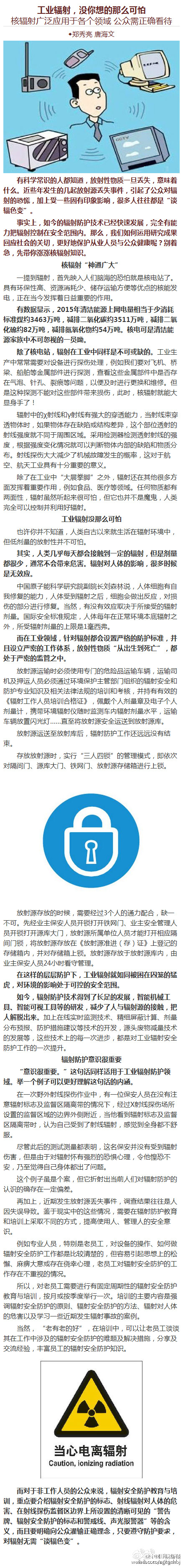 受一些固有印象影响,很多人往往都是“谈辐色变”。事实上,如今的辐射防护技术已经快速发展,完全有能力把辐射控制在安全范围内。我们几乎每天都会接触到一定的辐射,但是剂量都很少,通常不会带来危害。